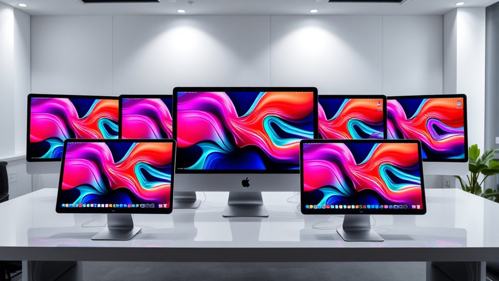 Selecting the right display quality for your 24-inch iMac is vital to guarantee vibrant visuals and comfortable viewing. A higher resolution, like 4.5K Retina, makes images and text look sharp and clear, which is essential for detailed work. Brightness levels, measured in nits, influence how well the display performs in different lighting, with 500 nits being standard for vivid visuals. Supporting up to 1 billion colors ensures accurate, rich hues for creative tasks and media. The display’s size and aspect ratio also matter, affecting your comfort and workspace efficiency. Features like True Tone and P3 wide color support further improve color accuracy and reduce eye strain during long sessions. Prioritizing these factors helps you find a screen that’s both beautiful and functional.