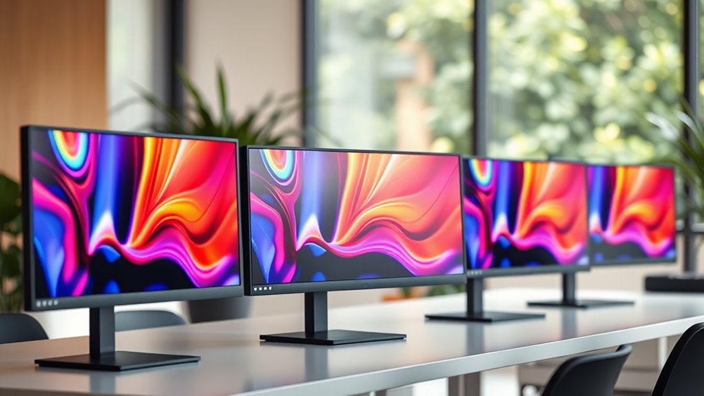 Just like a calm lake reflects the sky without strain, these 4K color E-Ink monitors let your eyes rest while delivering stunning visuals. Whether you’re working or unwinding, they’re designed to reduce fatigue and enhance comfort—bringing a peaceful, vibrant clarity to your daily routine. As I’ve explored, choosing the right monitor is like finding a clear, tranquil pond in a busy forest—your perfect escape for eye-friendly viewing in 2025.