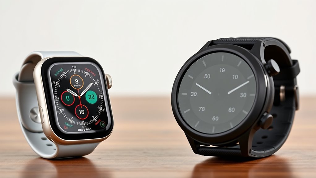 When considering durability and water resistance, size and fit become equally important factors to guarantee the watch feels comfortable and suits your lifestyle. The Series 11 has a 46mm case, offering a balanced size that suits most wrists without feeling bulky. It features adjustable bands and a slim profile, making it a comfortable choice for daily wear. In contrast, the Ultra 3 sports a larger 49mm case, ideal for those who prefer a more prominent display and have wrist sizes that can accommodate the bigger size comfortably. Its rugged design pairs well with wider, more durable straps, especially for outdoor or extreme activities. Ultimately, your choice depends on whether you prefer a lighter, discreet watch or a more substantial, adventure-ready device.