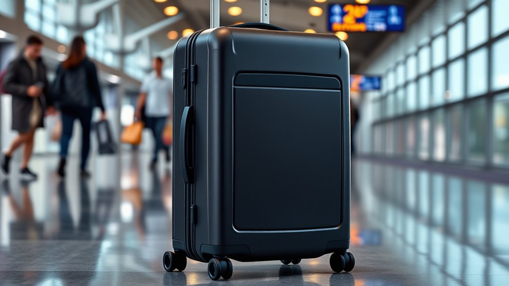 Security features are essential to guarantee your carry-on luggage with USB ports keeps your belongings safe during travel. I look for TSA-approved locks, so security can inspect my bag without damage or hassle. It’s important that the USB port is built-in and securely integrated to avoid accidental disconnections or damage. Reinforced zippers and compartments add extra protection against theft and tampering, giving me peace of mind. I also check if the luggage complies with airline regulations and security standards, ensuring smooth travel. Additional anti-theft features like lockable compartments or RFID-blocking pockets are a bonus, providing extra layers of security. Prioritizing these features helps me travel confidently, knowing my belongings are well-protected throughout my journey.