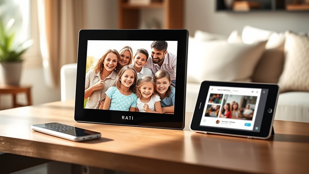 Adding customizable features to a digital photo frame can considerably enhance your viewing experience, making it easier to personalize and organize your photos. Many frames let you adjust transition effects, slideshow intervals, and captions to create a tailored display. You can also fine-tune brightness, contrast, and color modes to match your environment or mood. Some models allow creating playlists or themed albums, helping you showcase specific memories seamlessly. Advanced options include adding captions, date stamps, or weather info directly on photos for extra context. Scheduling automatic on/off, auto-rotation, and hiding or prioritizing images give you full control over what’s displayed and when. These features make your digital frame not just a display, but a personalized storytelling tool.
