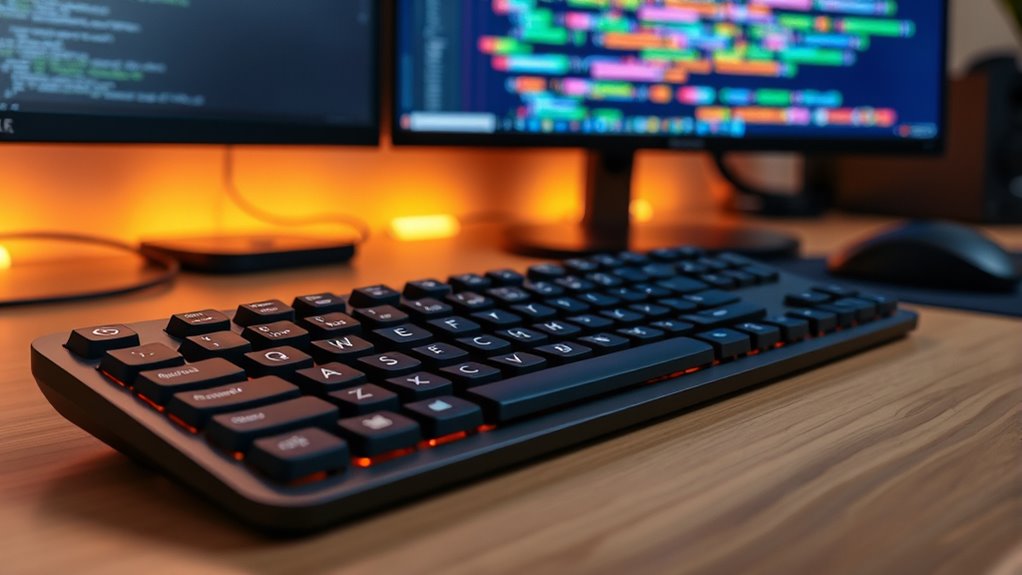 The way your key switches feel can considerably influence your typing comfort and fatigue during long programming sessions. Tactile, linear, or clicky switches each offer different feedback, affecting your overall experience. Low-force membrane switches provide a softer, quieter feel that reduces finger strain, making them ideal for extended use. Mechanical switches, with varying actuation forces and feedback profiles, let you customize your typing to suit personal preference and task demands. Silent or dampened switches can minimize noise, helping you focus in shared workspaces. Additionally, the responsiveness and travel distance of switches play a crucial role in preventing accidental keystrokes and improving accuracy. Choosing the right switch feel ensures a more comfortable, efficient, and enjoyable programming experience over long hours.