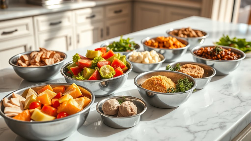 Choosing a gourmet pet food brand begins with scrutinizing ingredient quality, as this directly impacts your pet’s health and well-being. I look for brands that prioritize sourcing premium, natural ingredients like real meat, fruits, and vegetables, making certain each bite is nutritionally meaningful. I steer clear of artificial flavors, preservatives, fillers, and by-products, focusing instead on wholesome, minimally processed components. Certifications such as USDA approval and GMP compliance give me confidence in the safety and quality of ingredients used. Transparent labeling is also vital, allowing me to verify sourcing details and ingredient lists easily. Additionally, formulations developed with veterinary and nutritional experts ensure that the food meets or exceeds standards for balanced, complete nutrition, giving my pet the royal treatment they deserve.