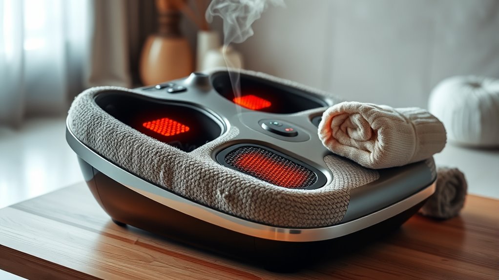 Did you know that regular maintenance can extend the life of your heated foot massager by up to 30%? I recommend unplugging it after use and wiping the surfaces with a damp cloth to keep it clean. Avoid submerging any parts in water, and check the manufacturer’s guidelines for specific cleaning instructions. This simple routine helps guarantee safe, effective use and keeps your device in top condition.