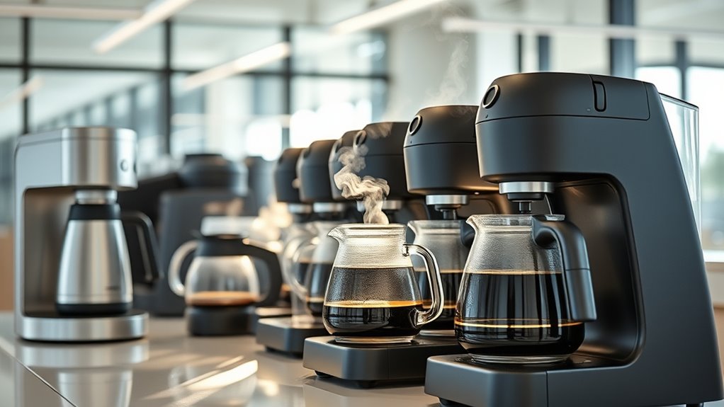 Choosing the right high-capacity drip coffee maker can transform your office mornings from chaos to calm. With options that brew enough for everyone, you’ll keep energy levels soaring like a rocket. Trust me, once you find the perfect machine, your team’s productivity will skyrocket faster than you can say “coffee break.” So, pick wisely and watch your office become a caffeine-fueled powerhouse—because nothing beats starting the day with a flawless, hot cup of coffee.
