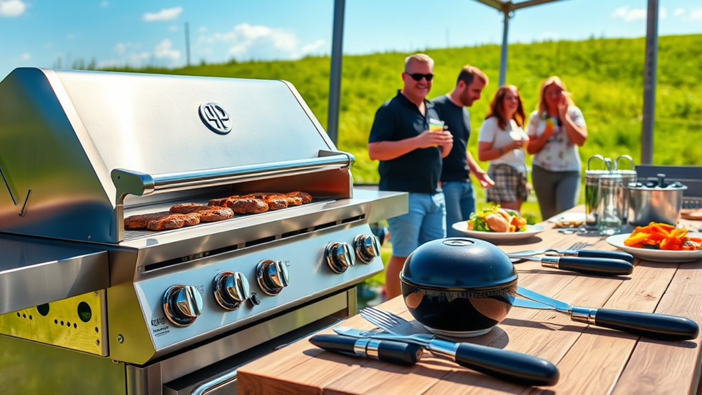 Safety features are crucial for high-end tailgating grills. I always look for automatic shut-off systems, so I don’t worry if I forget to turn off the grill. A sturdy, non-slip base keeps it stable on uneven surfaces. I also prioritize grills with heat-resistant handles and built-in thermometers for safe cooking. Finally, good ventilation and leak-proof gas connections prevent accidents, making my tailgating experience both fun and safe.