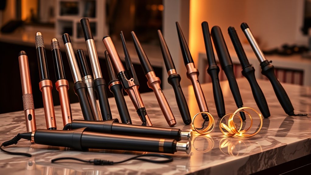 When selecting high-end hair curlers and wands, considering their styling versatility is key to achieving a variety of looks. A wider range of barrel sizes lets me create everything from tight curls to loose waves effortlessly. Interchangeable barrels and attachments allow me to switch styles without needing multiple tools, saving space and money. Variable temperature settings help me customize heat for different curl types and my hair’s sensitivity, ensuring healthy styling. Tapered, conical, or wavy barrels expand my creative options, letting me craft unique textures and shapes. Having a set with multiple styling options maximizes flexibility, so I can easily switch from a polished look to casual waves. Overall, flexibility ensures I can experiment and perfect a range of salon-quality styles at home.