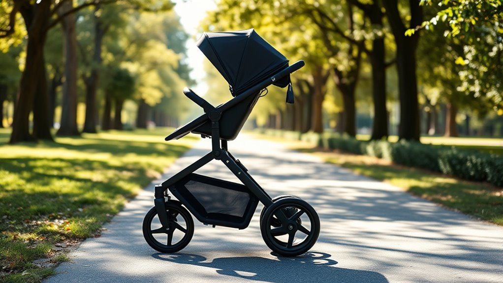 Maneuverability and control are crucial factors when choosing a high-end jogging stroller, especially since I want to navigate both crowded sidewalks and rough terrains with ease. Swivel lock front wheels are essential, allowing me to switch between nimble steering for walking and stability for running. Advanced suspension systems, like mountain-bike-style shock absorbers, keep the ride smooth over uneven surfaces. Larger, air-filled tires with ball bearings make steering effortless at high speeds and provide a smoother experience overall. Adjustable tracking and responsive steering mechanisms give me precise control, which is vital in tight or crowded spaces. Plus, quick-release wheels and foldable designs make handling and transporting the stroller easier when I’m on the go. These features ensure I stay in control no matter the terrain.