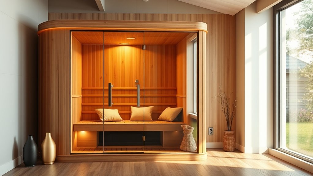 Maintaining a home sauna requires regular attention to keep it in top condition and extend its lifespan. I recommend cleaning the interior surfaces and accessories frequently to prevent mold, bacteria, and odors. Use gentle cleaning agents like mild soap or specialized wood cleaners to avoid damaging the finish. It’s also important to check and replace air filters or ventilation parts periodically, ensuring good airflow and reducing dust buildup. Regularly inspect electrical components and heating panels for signs of wear or damage; don’t hesitate to hire a professional for maintenance if needed. Ultimately, follow the manufacturer’s guidelines on humidity levels and cleaning schedules. Proper upkeep not only preserves your sauna’s appearance but also guarantees safe, consistent performance over time.