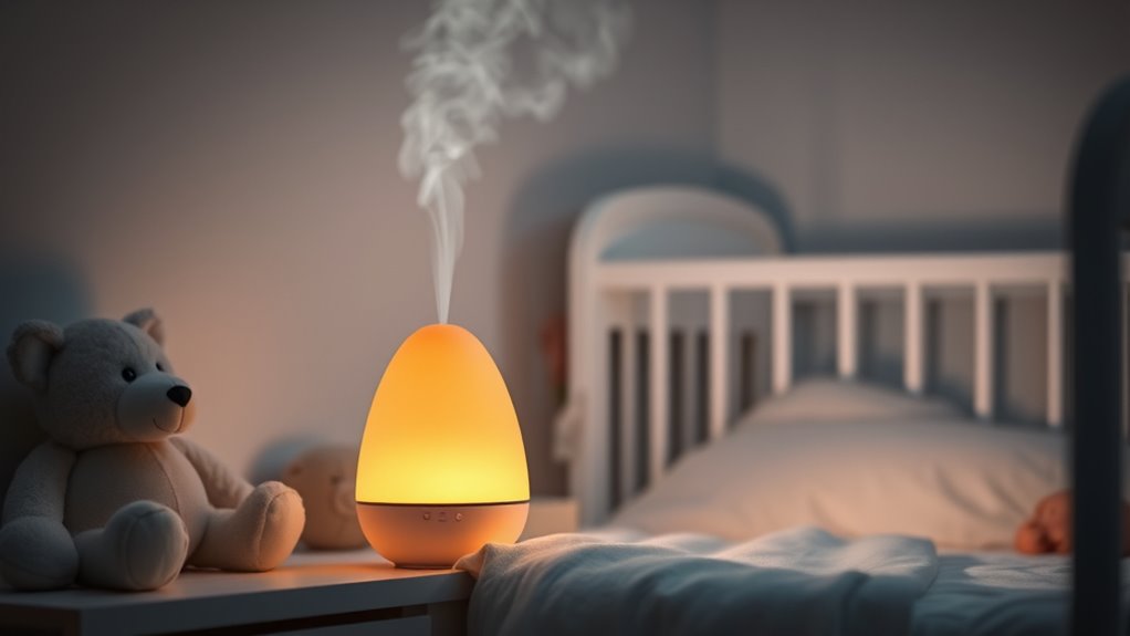 Like a gentle lighthouse guiding ships safely, night lights in humidifiers can soothe your baby, but they might also disturb sleep if they’re too bright or flicker. I’ve found that dim, soft lights are best—they create a calming environment without overstimulating. If your little one is sensitive, opt for a humidifier with adjustable light settings. That way, you keep the room cozy and promote peaceful sleep all night long.
