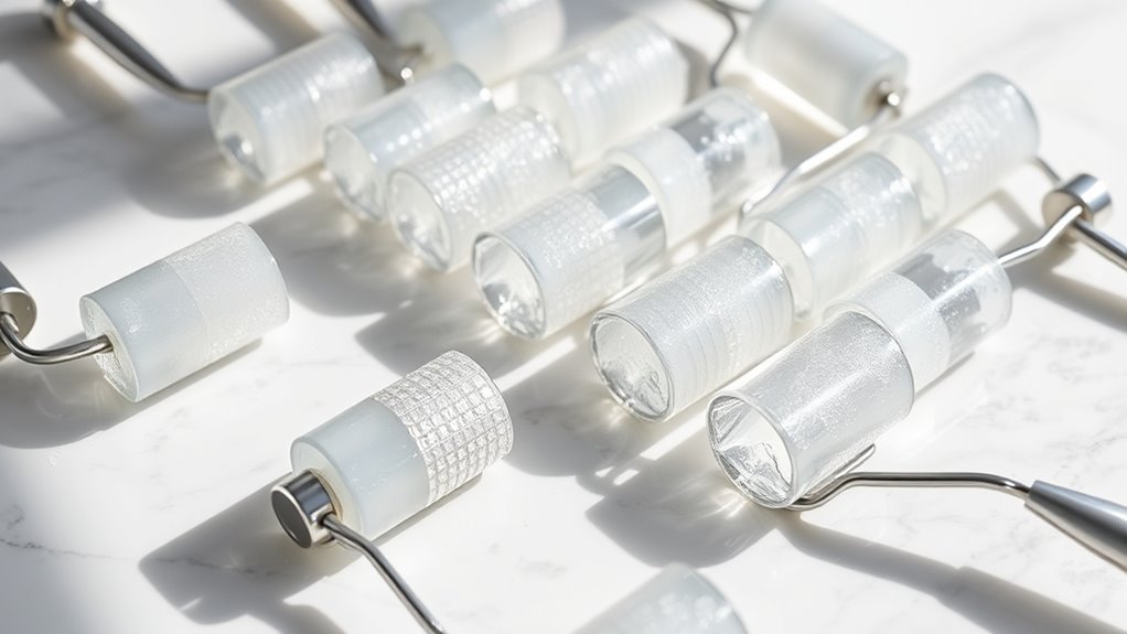 Since multi-functionality features can profoundly enhance the effectiveness of an ice roller, it’s important to contemplate tools that go beyond simple cooling. Look for ice rollers that combine massage, lymphatic drainage, and targeted treatment options to maximize skin rejuvenation and reduce puffiness. Some models include interchangeable heads or extra tools like Gua Sha, which help with contouring and lifting. Versatile rollers can also address various needs, from calming inflammation and easing muscle tension to soothing headaches. Choosing one with adjustable cooling durations or refillable parts allows for customized treatments tailored to your skin’s evolving concerns. These multi-purpose features not only streamline your skincare routine but also ensure you get the most benefit from your investment in a high-quality ice roller.