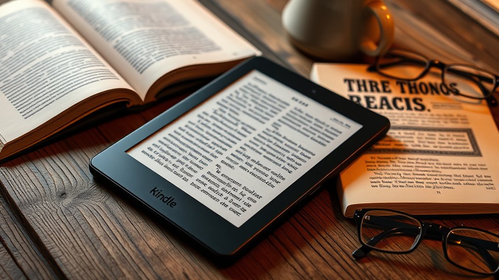 Imagine holding a lighthouse guiding your way through a storm—that’s how Kindle e-readers perform in bright sunlight. I’ve found they’re highly effective outdoors, thanks to their glare-free screens that mimic paper. No need to squint or shade your eyes. With their high contrast and adjustable lighting, you can read comfortably even under the blazing sun, making them perfect for beach days or outdoor adventures.