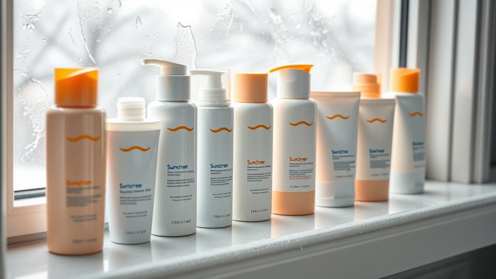 Since winter skin tends to be more sensitive and prone to dryness, choosing sunscreens that are gentle and unlikely to cause irritation is essential. I recommend selecting products labeled as hypoallergenic or suitable for sensitive skin, as they’re formulated to minimize irritation risks. Look for formulations free from common irritants like alcohol, fragrances, and artificial colors, which can trigger reactions. Physical (mineral) sunscreens containing zinc oxide or titanium dioxide are typically gentler on sensitive skin and provide effective protection. It’s also wise to choose products that have been dermatologically tested and approved for sensitive skin, ensuring safety. Additionally, consider sunscreens with soothing ingredients like niacinamide, aloe vera, or ceramides, as these help reinforce your skin barrier and keep your skin comfortable during harsh winter months.