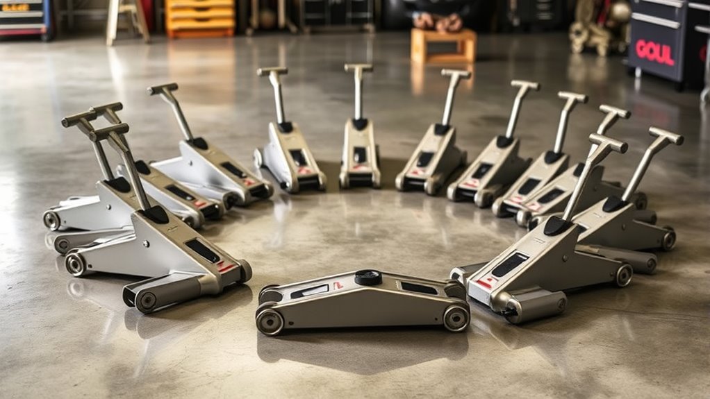 Choosing a low-profile aluminum floor jack often comes down to weight and portability, since a lighter jack is easier to maneuver and reduces fatigue during use and transport. Aluminum jacks generally weigh between 36 to 70 pounds, making them much easier to handle than steel counterparts with similar capacity. This lighter weight enhances ease of movement, especially under low-clearance vehicles, and helps prevent operator fatigue. Many models include features like handles, swivel casters, or detachable components that boost portability, allowing quick repositioning without hassle. A more portable jack means you can swiftly slide it into position, saving time and effort during maintenance. Ultimately, selecting a lightweight, portable jack improves efficiency, reduces strain, and makes handling under low-profile vehicles more manageable.