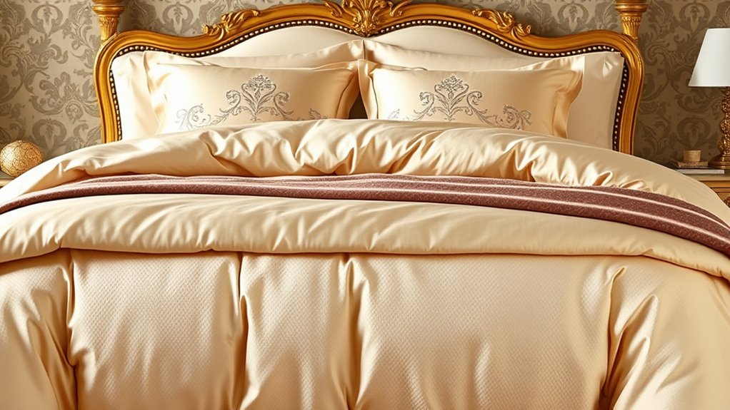 Caring for your luxury bedding is like tending to a delicate garden — it requires gentle, attentive care. I recommend washing your high-end sets with mild, sulfate-free detergents and avoiding bleach. Always follow the care label, use cold water, and opt for a gentle cycle. Air drying is best, but if you must use a dryer, select low heat. Regularly fluff and rotate your bedding to keep it fresh and plush.