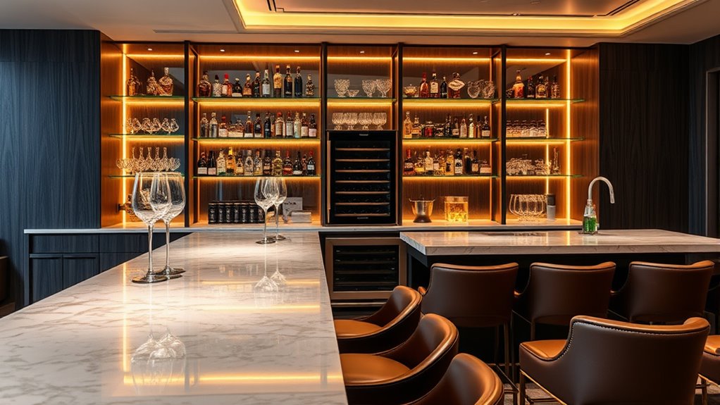 When selecting a luxury home bar setup, I focus on the durability of materials and the variety of tools included to guarantee longevity and versatility. I also consider how well the setup fits my space with smart storage options and how it complements my style aesthetically. Finally, I weigh the price against the value it offers to make a choice that’s both elegant and practical.