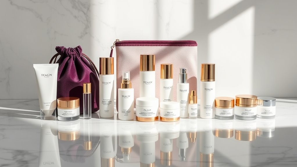 Have you ever considered how the packaging of a luxury skincare set can influence your overall experience? Elegant, high-quality packaging not only looks stunning but also enhances the product’s perceived value and gift appeal. If you’re always on the go, look for sets with portable, travel-sized bottles and compact jars that fit easily into your bag. It’s essential that the packaging is secure and leak-proof to prevent spills and keep products fresh during transport. Eco-conscious buyers will appreciate recyclable or eco-friendly materials that reduce environmental impact. Additionally, user-friendly features like pump dispensers and minimal waste can make application easier and more hygienic. Thoughtful packaging and portability ensure your anti-aging routine remains seamless, whether at home or traveling.