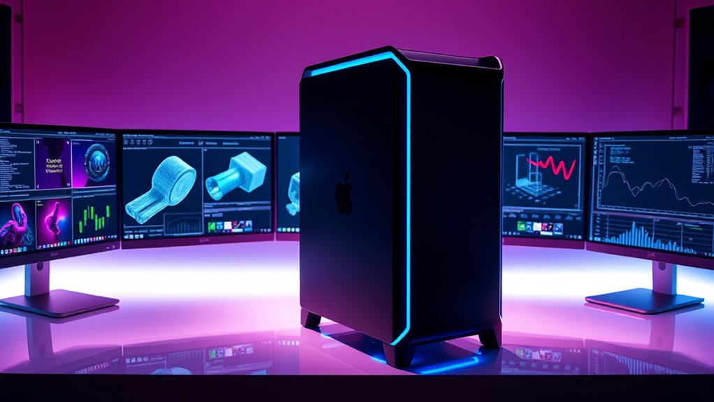 Choosing a Mac Pro for 3D and simulation work hinges on understanding its processing power. For complex rendering and detailed simulations, I recommend a high-core count processor like the M4 Max with 40 cores, delivering the raw computational power needed. Demanding workflows such as video editing and physics simulations benefit from multi-core CPUs that handle parallel tasks efficiently. The amount of unified memory (RAM) is also critical, as it allows the Mac Pro to manage large datasets and multitask smoothly during intensive processes. Additionally, hardware-accelerated media engines within the processor speed up decoding, encoding, and rendering, which is essential for real-time visualization. Opting for a more powerful chip like the M4 Max future-proofs your setup and guarantees top performance as your 3D and simulation workloads grow.