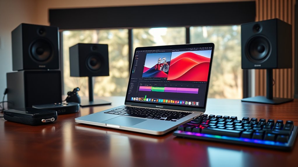 To guarantee smooth video editing on a MacBook Pro, you need ample storage and sufficient memory. I recommend at least 1TB of storage to accommodate large video files and project assets without constantly managing space. Faster storage options like SSDs cut down data transfer and rendering times, making your workflow more efficient. Sufficient RAM, ideally 16GB or more, is vital for multitasking and handling high-resolution footage, especially 4K or higher. Higher memory and storage configurations help prevent bottlenecks during intensive editing tasks. Balancing these two factors based on your project complexity ensures smoother performance and responsiveness. Investing in ample storage and memory now means less frustration and more productivity as your projects grow in size and detail.