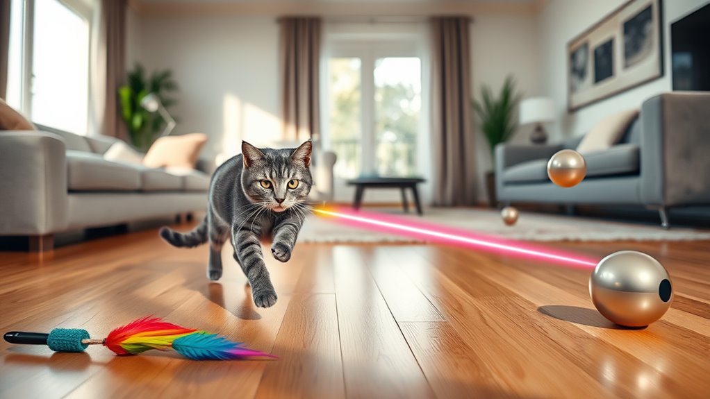 If you’re looking for the best motion-sensor interactive cat toys, I can help you find options that keep your feline entertained all day. These toys feature realistic prey-like elements, adjustable movement speeds, and safe, durable materials. Many are rechargeable and include modes that activate automatically when your cat approaches, providing mental and physical stimulation. Keep in mind safety and space considerations, and there’s a variety to match different play styles—stick around to discover some top choices!