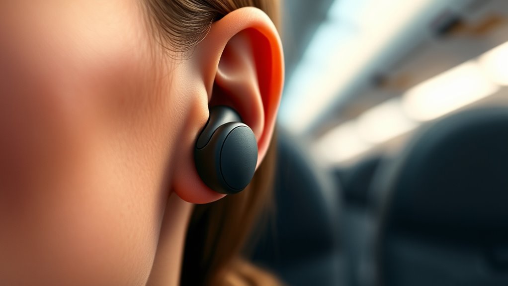 Choosing earbuds with strong noise cancellation is essential for a comfortable flight experience, and understanding how effectively they reduce noise can help you make the right choice. High-quality models can block up to 98% of external sounds, measured in decibels, making your flight much quieter. Active noise canceling (ANC) works by detecting external sounds with microphones and creating anti-phase signals to cancel them out, especially effective against constant, low-frequency noises like engine hums. The Noise Reduction Rating (NRR) indicates overall noise suppression, with higher values offering better performance. Digital ANC often provides more adaptive, precise noise reduction across various frequencies than analog systems. Remember, a proper, snug fit enhances noise cancellation by ensuring a good seal, maximizing the earbuds’ effectiveness.