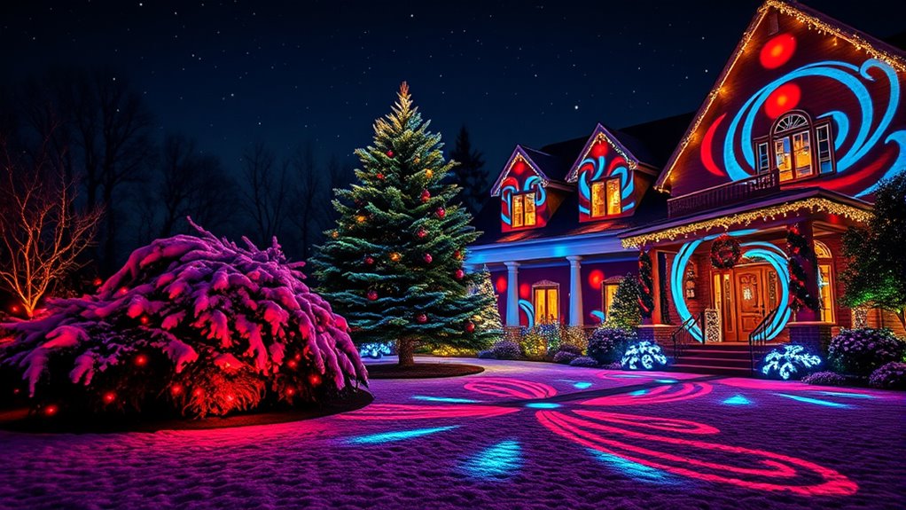 For anyone looking to create stunning outdoor holiday displays that withstand the elements, waterproof firefly laser projector lights are an excellent choice. These projectors offer vibrant RGB colors and 12 light combinations, creating a mesmerizing firefly effect. You can easily switch between static and dynamic displays, adjusting the speed for the perfect ambiance. With an IP65 waterproof rating, they handle cold, heat, and rain, making them ideal for year-round use. Installation is simple with ground stakes, bases, or wall mounts. Plus, remote control and timer functions give you effortless customization, ensuring your outdoor decor stays dazzling throughout the season.
