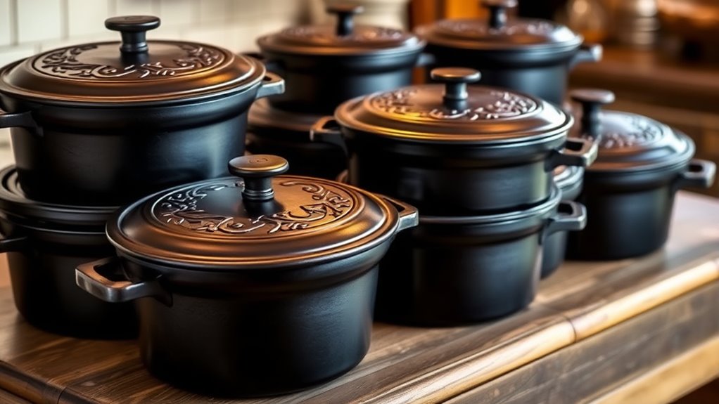 When selecting a cast iron Dutch oven, considering its design and aesthetic appeal can make a big difference in how well it complements your kitchen. I look for vibrant enameled coatings in colors like deep blue, green, or red to add visual interest. The shape matters too—round or oval—depending on the recipes I prepare and the style I want. A well-designed Dutch oven features sturdy, ergonomic handles that make lifting easy, and a matching lid that enhances its overall look. The exterior finish, whether matte or glossy, not only impacts its appearance but also affects its resistance to staining and chipping over time. Ultimately, choosing a piece that combines beauty with functionality helps elevate both my cooking experience and kitchen decor.