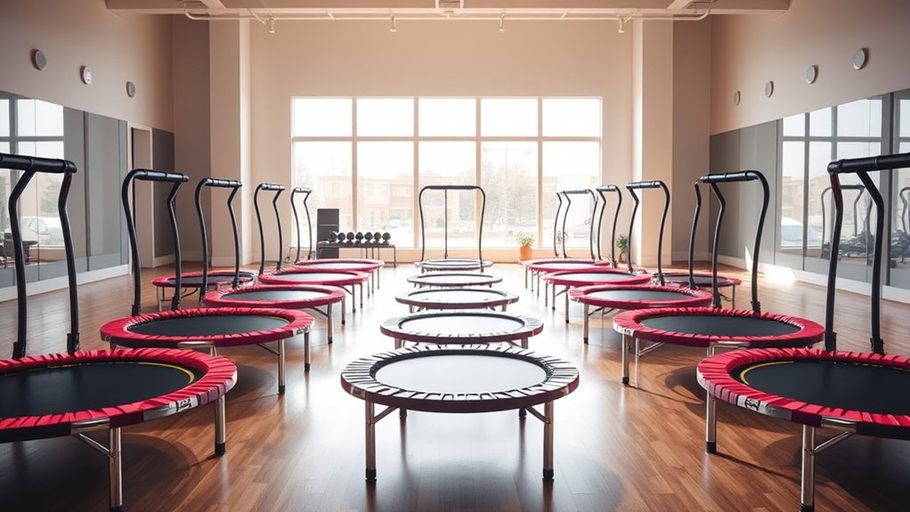I’ve explored the top premium fitness trampolines that combine durability, stability, and versatility to boost your workouts. These sets feature sturdy frames, adjustable handlebars, and high-capacity support, making them suitable for all fitness levels and ages. They’re portable, safe, and perfect for low-impact cardio, strength, or rehab exercises. Want to discover which models stand out and how they can elevate your routine? Keep going, and I’ll guide you through the best options.