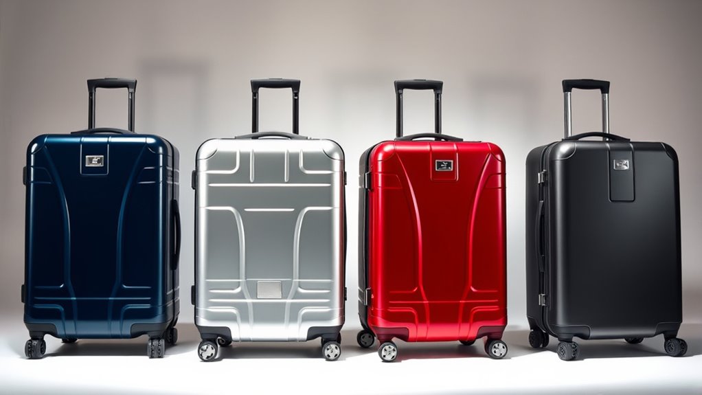 Choosing the right durability materials for a hard-shell suitcase set is essential because these materials determine how well your luggage withstands daily wear and unexpected impacts. High-quality options like polycarbonate, ABS, PC+ABS composites, and aluminum offer excellent impact resistance and longevity. Polycarbonate is lightweight yet shatter-resistant, making it perfect for frequent travelers. ABS provides a tough exterior with good scratch resistance, though it may absorb impacts slightly less effectively than polycarbonate. Aluminum shells and frames deliver superior strength and a sleek look, often with added reinforcement for extra protection. The material you select directly affects your suitcase’s ability to endure impacts, scratches, and long-term wear and tear, ensuring your investment stays protected through countless journeys.