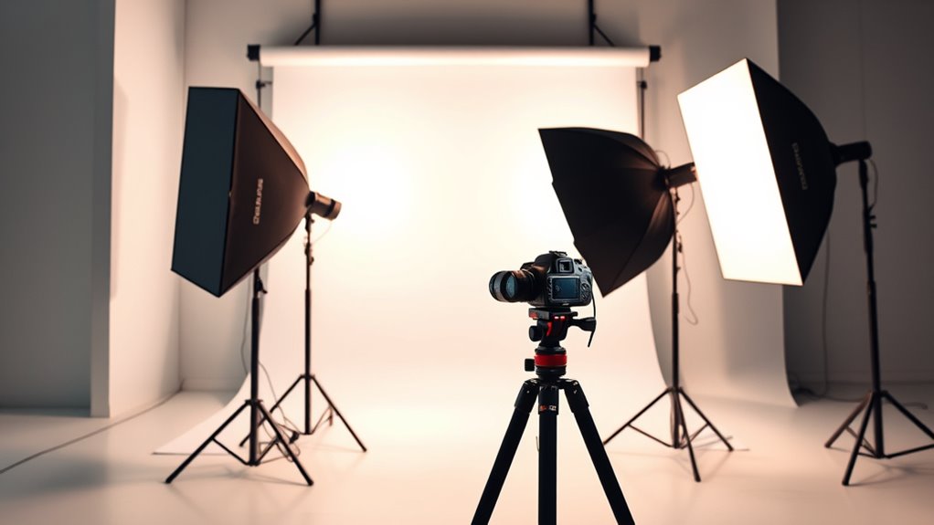 Flexibility and precise control are essential features in premium studio lighting kits, allowing me to tailor illumination quickly and accurately for any shoot. I look for kits with stepless brightness and color temperature adjustments, so I can fine-tune the light without limitations. Adjustable angles are crucial too; rotatable softboxes and flexible mounting options let me direct light exactly where I need it. Multiple control modes, like remote, app, or DMX, provide convenience, especially when working from different locations or angles. I also check that softboxes and reflectors can tilt or rotate (210° or 360°), giving me versatility in shaping light. Stable, adjustable mounts ensure quick height and angle changes without compromising safety, streamlining my workflow and improving overall results.