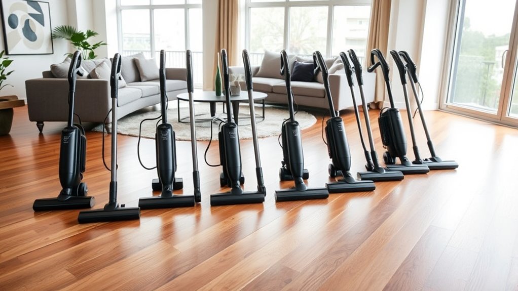 Lightweight canister vacuums make cleaning in apartments much easier by allowing me to move effortlessly through tight spaces and up stairs. Vacuums under 15 pounds are perfect for quick, strain-free handling. Their compact designs, with ergonomic handles and minimal bulk, reduce fatigue during extended cleaning sessions. A well-balanced weight distribution between the canister and wand makes maneuvering smoother and less tiring. These models often include features like retractable cords and small footprints, making storage and transport a breeze. The lower overall weight means I can clean stairs, furniture, and hard-to-reach spots without extra effort. For apartment living, choosing a lightweight vacuum enhances convenience without sacrificing power or silence, making my cleaning routine more comfortable and efficient.