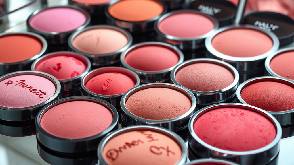 Avoid ingredients like parabens, phthalates, and synthetic fragrances in affordable blush dupes, as they can irritate your skin or disrupt your hormones. Look out for formulas free from these chemicals, opting instead for natural ingredients like shea butter, jojoba oil, or mineral pigments. Prioritize products that are dermatologist-tested and cruelty-free, ensuring your skin stays healthy and glowing while you enjoy budget-friendly beauty.