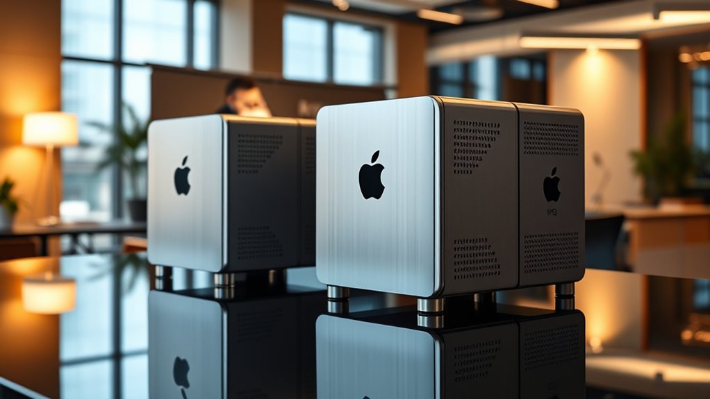 If you’re exploring renewed Mac Pro desktops in 2025, you’ll find options with powerful M4 Max and M4 chips, offering up to 36GB RAM and 8TB storage, perfect for demanding tasks like video editing and 3D rendering. These models feature vibrant Retina displays, multiple port options, and seamless ecosystem integration. Although they’re pre-owned, quality checks and warranties guarantee reliability. Keep going, and you’ll discover detailed insights to help you choose the best fit for your workflow.