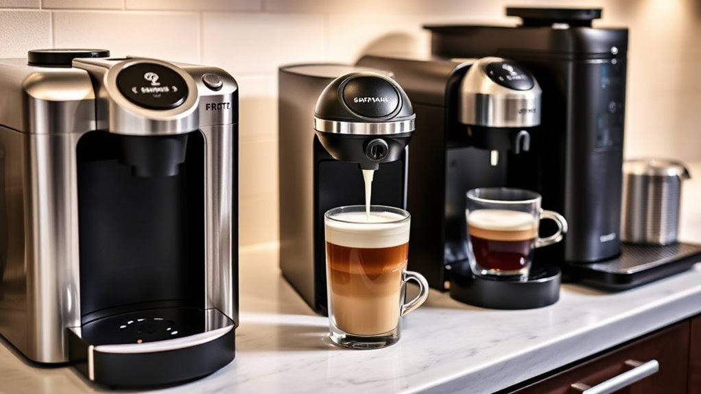Most single-serve coffee makers with built-in frothers come with multiple brew size options, typically ranging from 6 oz to 24 oz. This variety lets you customize your coffee strength and volume, whether you want a quick shot or a large, frothy drink. Many models also include specific sizes for travel mugs, often up to 8 inches tall, making them perfect for on-the-go mornings. Adjustable brew sizes add versatility, allowing you to brew concentrated espresso shots or larger servings for family or friends. Selecting a machine with multiple brew size options guarantees you’re prepared for any occasion, from a quick pick-me-up to entertaining guests. Flexibility in brew sizes is essential for tailoring your coffee experience to your preferences and needs.