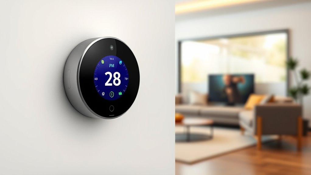 Smart thermostats equipped with learning features can significantly cut energy bills by automatically adjusting heating and cooling based on your routines and occupancy patterns. Many models save between 12% and 15% annually, leading to noticeable financial savings. They analyze your historical energy use and suggest schedule tweaks to maximize efficiency. Features like Auto-Away or Eco Mode activate when the home is unoccupied, preventing unnecessary energy consumption. Additionally, these thermostats allow you to monitor your energy history and usage patterns, helping identify further savings opportunities. By intelligently managing your comfort and energy use, these devices not only reduce costs but also promote a more sustainable lifestyle. When choosing a smart thermostat, consider its ability to optimize energy savings through adaptive learning and smart features.