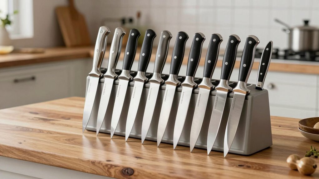Choosing the right stainless steel knife set starts with understanding blade material quality, which directly affects performance and longevity. High-carbon stainless steel blades stand out because they offer superior edge retention and durability compared to standard stainless steel. The hardness of the steel, measured in HRC, determines how long a blade stays sharp and how well it resists wear. Forged blades from a single piece of steel tend to be stronger and less prone to cracking or trapping food. The composition of the steel, including elements like chromium and molybdenum, influences corrosion resistance and rust-proof qualities. Advanced manufacturing techniques, such as laser cutting and cryogenic tempering, further enhance blade sharpness, stability, and overall performance, ensuring your knives stay reliable over time.