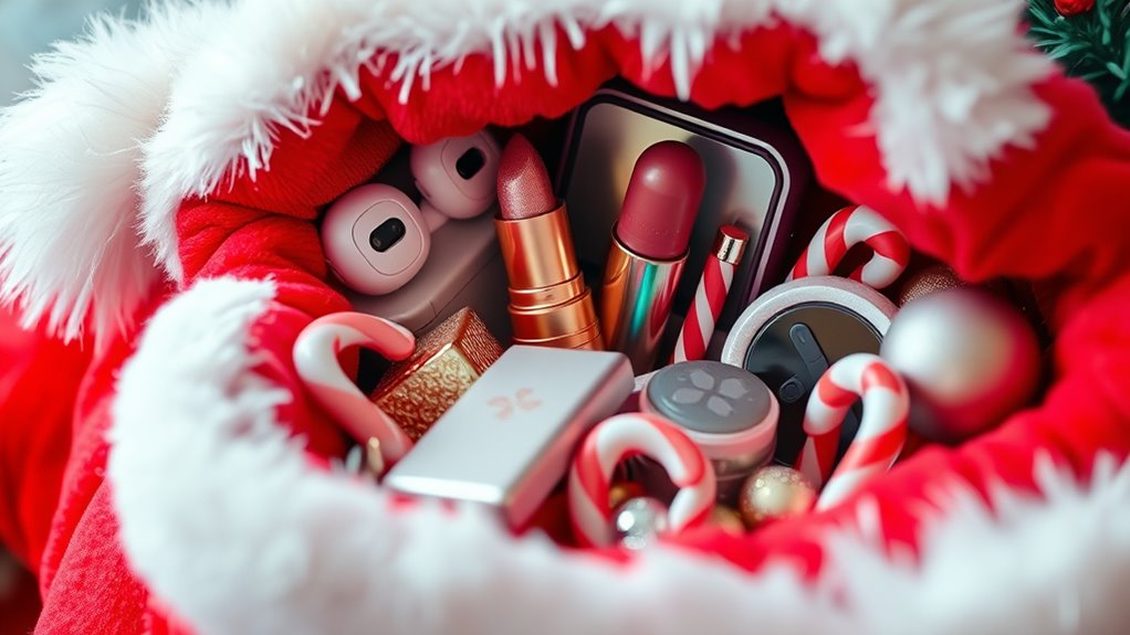 Staying on top of current trends is essential when choosing stocking stuffers for teens in 2025 because it guarantees your gifts resonate with their evolving interests and the latest cultural moments. By focusing on trending accessories, gadgets, or entertainment, your gifts will feel fresh and exciting. Incorporating themes like eco-friendliness or tech-savviness aligns with teens’ values and preferences. Recognizing viral trends on platforms like TikTok or Instagram helps you select items already popular among their peers, increasing the likelihood of appreciation. Trend-relevant gifts tend to generate more engagement and enthusiasm, making them a smart choice for holiday gifting. Staying updated with what’s hot ensures your presents are not only desirable but also meaningful, reflecting the dynamic interests of today’s teens.