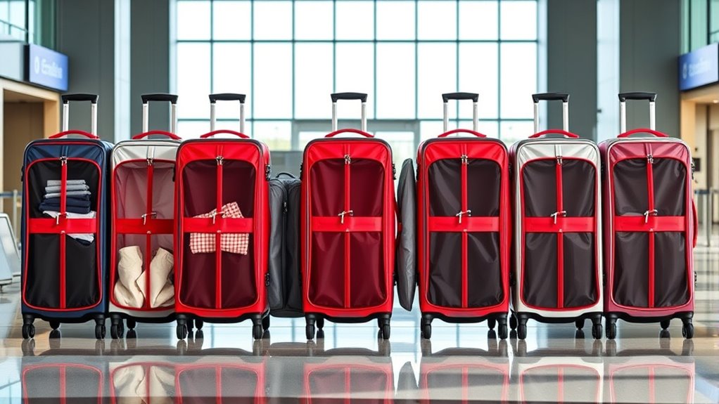 When evaluating travel garment bags with wheels, paying attention to organizational features can make a significant difference in your packing experience. I look for bags with multiple compartments like zippered pockets, mesh sections, and tie straps to keep clothing and accessories secure and prevent shifting. Dedicated shoe pockets, wet/dry compartments, and accessory organizers help me separate items, keeping everything tidy and accessible. Interior features such as removable mesh pockets and adjustable tie-down straps add flexibility, making unpacking quick and easy. I also prioritize layouts that support fast packing and unpacking, reducing wrinkles and simplifying retrieval. External pockets or add-a-bag straps are invaluable for quick access to essentials and securing smaller items, ensuring efficient organization on the go.