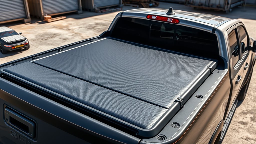 Ensuring your tri-fold hard-shell truck bed cover withstands the elements requires paying close attention to its weather-resistant features. These covers are made from materials like FRP, aluminum, or polymer, which resist damage from rain, snow, and dust. Look for models with tight-sealing perimeter gaskets and advanced locking systems to keep out water during heavy storms. The panels are designed to be tear-resistant and UV-stable, ensuring long-term protection against harsh environmental factors. Many covers feature aerodynamic shapes and precise fitment to reduce rain intrusion and wind-driven debris. Proper installation is vital; secure clamps and seals help maintain a waterproof barrier. Choosing a cover with these weather-resistant qualities guarantees your cargo stays dry, protected, and secure in all weather conditions.