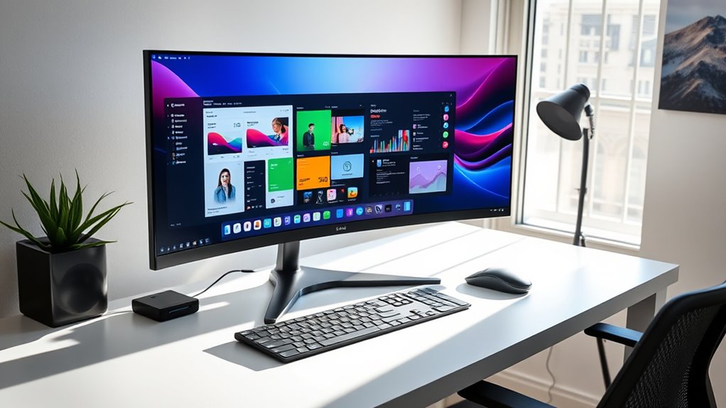 Imagine a seamless bridge connecting different worlds—ultrawide monitors do just that by supporting multiple operating systems effortlessly. I’ve personally used them to switch between Windows and macOS without a hitch, noticing no lag or compatibility issues. Their flexible hardware and software configurations make it easy to run diverse OSes side by side, boosting productivity and simplifying multitasking. So, yes, ultrawide monitors support multiple operating systems seamlessly, making your workflow smoother.