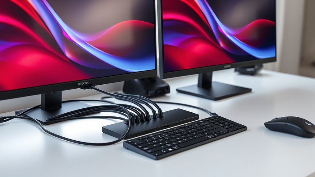 Think of these docks as the conductor of a symphony—they can often lead multiple monitors in harmony. Many support daisy-chaining, but it depends on the specific model and its ports. I’ve found that newer docks with Thunderbolt 3 or 4 often handle multiple monitors seamlessly, creating a fluid, connected workspace. Just check each dock’s specs to verify it supports daisy-chain configurations for your multi-monitor setup.