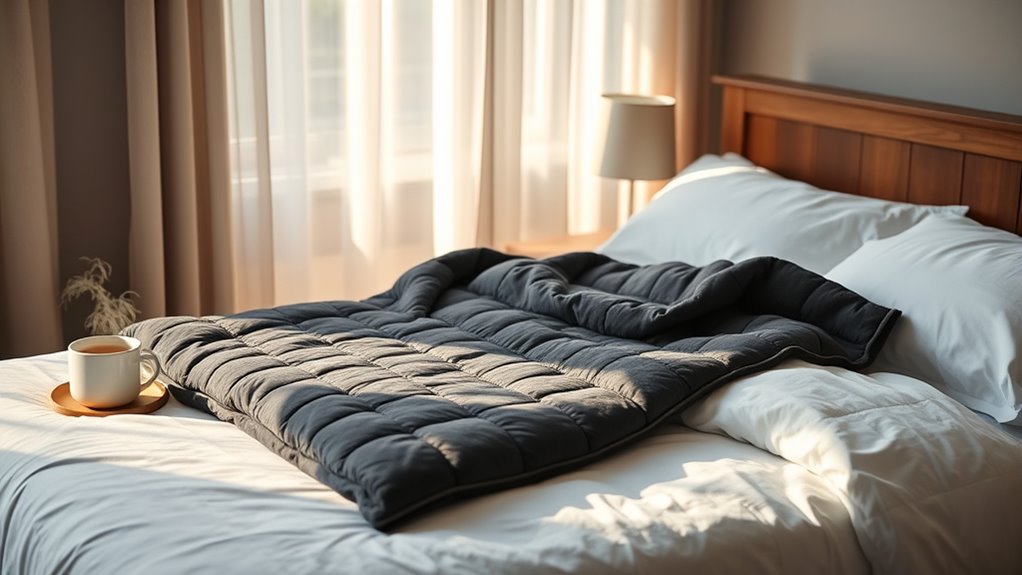 The right size and fit of a weighted blanket can considerably impact its effectiveness in easing anxiety. An appropriately sized blanket should match your body size to ensure even pressure distribution without hanging over the edges. It’s best to choose a blanket that fully covers your body without excessive draping off your bed or couch, maximizing comfort and therapeutic benefits. The weight is equally important; it should be about 8-12% of your total body weight. A well-fitting blanket stays in place during sleep or relaxation, preventing shifting that can lessen its calming effects. Correct sizing and fit not only enhance comfort but also help you get the most out of your weighted blanket’s anxiety-relieving properties.