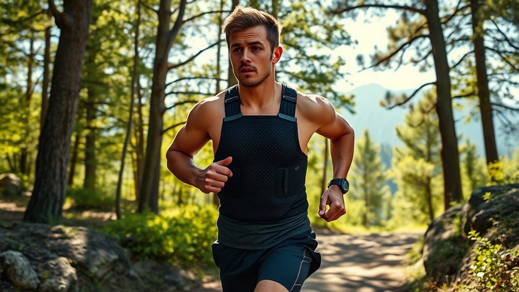 Choosing the right weighted vest involves guaranteeing it supports a variety of exercises, from running and calisthenics to strength training. I look for a vest with a versatile design that allows seamless movement across different activities. The weight range and adjustability are vital—being able to tailor the load helps me progress safely. Comfort features like padded straps and ergonomic weight distribution prevent chafing and restrictiveness during dynamic movements. Quick weight adjustments or removable plates are essential for adapting to changing workout intensities. Additionally, if I plan to train outdoors or during high-intensity sessions, I prefer vests with safety features like reflective stripes or secure pockets. Compatibility across different exercises ensures I get the most benefit without sacrificing comfort or safety.