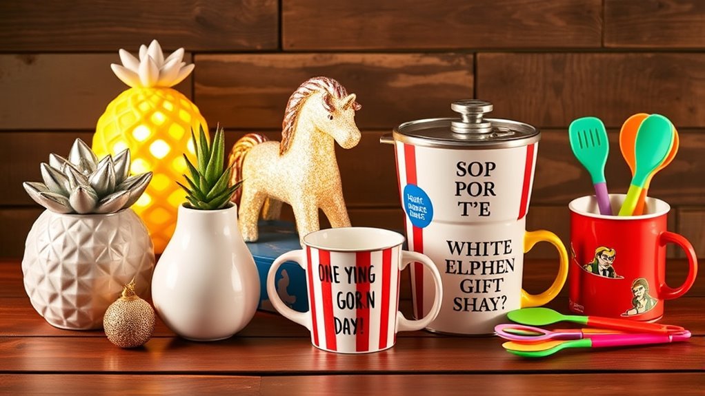 Humor and fun are key elements to contemplate when selecting white elephant gifts under $50, as they help create a lively and memorable exchange. Humorous gifts tend to spark laughter and engagement, making them perfect icebreakers. Quirky items often become keepsakes, increasing their appeal despite the low price. Gifts with clever humor or playful features are more likely to be re-gifted and shared among friends, boosting the fun atmosphere. Incorporating pop culture references or trending jokes can make the gift more relatable and entertaining. The best humorous gifts strike a balance—they’re funny yet practical enough for recipients to enjoy and use. Ultimately, a well-chosen humorous gift can elevate the entire event, ensuring everyone has a good laugh and memorable experience.