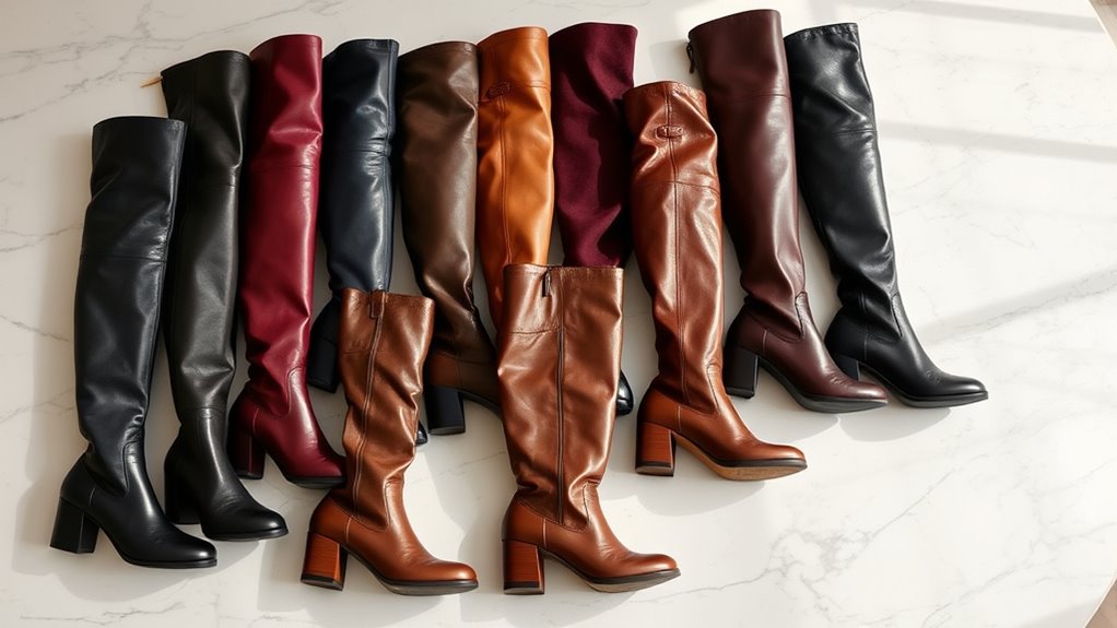 Supportive features are essential to guarantee your wide-calf knee-high boots provide both comfort and stability. Elastic panels or stretch fabric help the boots conform to your leg movements, preventing pinching and offering a flexible fit. Cushioned insoles with arch support are key for stability and reducing fatigue, especially during long wear. Chunky block heels distribute weight evenly, enhancing balance and minimizing strain on your ankles. Secure closures like side zippers or adjustable straps ensure the boots stay in place and fit properly, preventing slipping. Reinforced stitching and durable materials add to the overall support, ensuring your boots last and continue to support your legs comfortably over time. These features make a significant difference in daily comfort and stability.