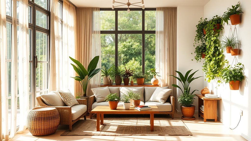 In today’s fast-paced world, bringing nature into your home isn’t just a trend—it’s a proven way to boost well-being and create a calming environment. You can achieve this by incorporating indoor plants and optimizing natural lighting. Indoor plants are more than just decorative accents; they are living elements that connect you directly with nature. As you select plants, consider varieties like snake plants, pothos, or peace lilies, which are easy to care for and thrive indoors. Placing these plants near windows or in well-lit areas ensures they get the sunlight they need to grow healthy and vibrant. The presence of greenery has been shown to improve air quality, reduce stress, and elevate your mood. Plus, tending to your indoor plants gives you a daily touch of nature, fostering a sense of responsibility and mindfulness. Additionally, choosing energy-efficient lighting options can further enhance your environment by reducing electricity use while maintaining optimal light levels.