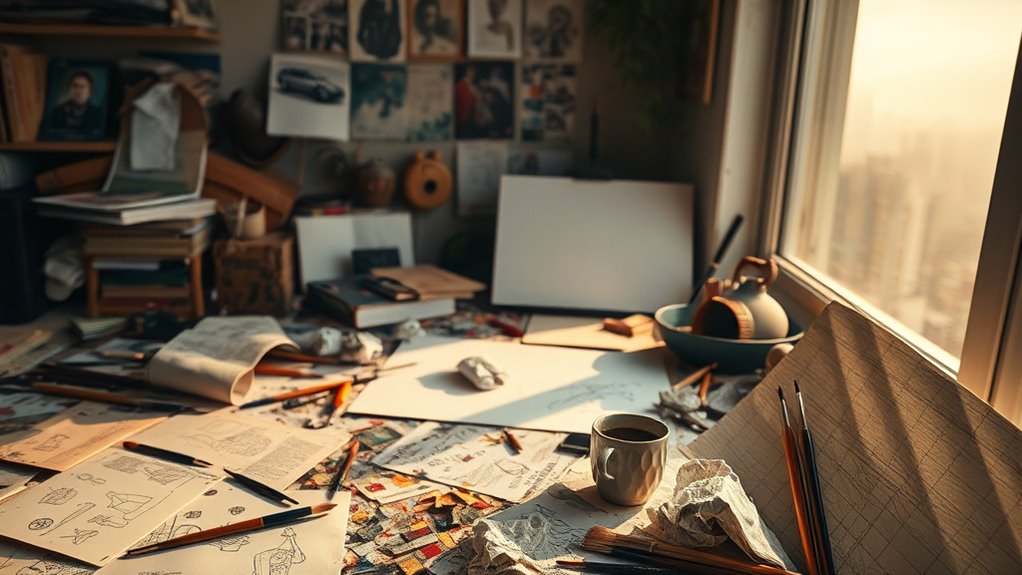 Creative blocks often happen because of mental barriers like self-doubt, fear of failure, or perfectionism, which make you hesitant to try new ideas. Your environment also plays a role—cluttered or uninspiring spaces can stifle your creativity. To overcome these, try changing your mindset to view mistakes as learning opportunities and adjust your surroundings to boost inspiration. Keep exploring these strategies, and you’ll discover how to unleash your creative flow more effortlessly.
