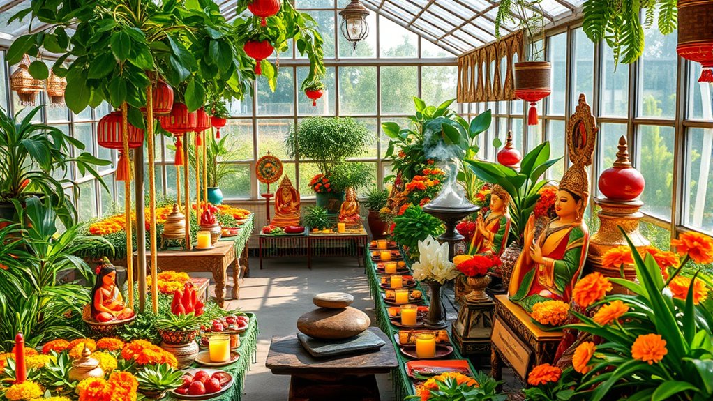To create a balanced altar, choose a spot in your greenhouse that feels warm and energetically inviting. Arrange your symbols and elements so they complement each other visually and energetically, avoiding clutter. Keep the setup harmonious by balancing height, color, and placement, ensuring positive energy flows freely. Incorporating cultural significance into your arrangement can enhance its spiritual impact and resonance.