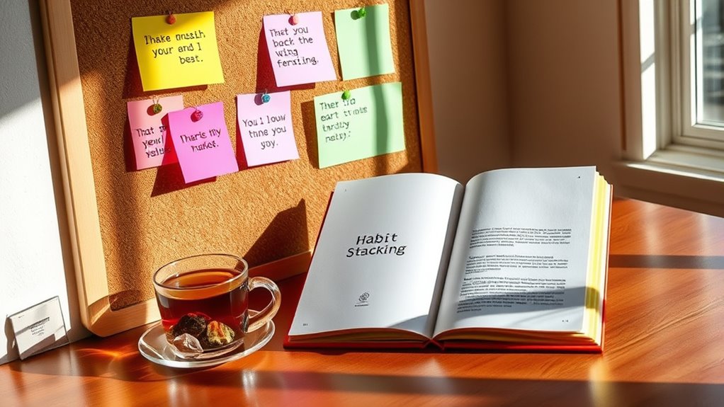 To practice habit stacking for manifestation, combine small daily routines like journaling about your goals and practicing gratitude with visualization right afterward. Keep these activities consistent by setting specific times and creating a calming environment. Linking these practices forms a seamless routine that reinforces your intentions and aligns your subconscious. As you build this habit, it becomes a powerful signal to the universe. Stay tuned to discover how optimizing your environment enhances this process even further.