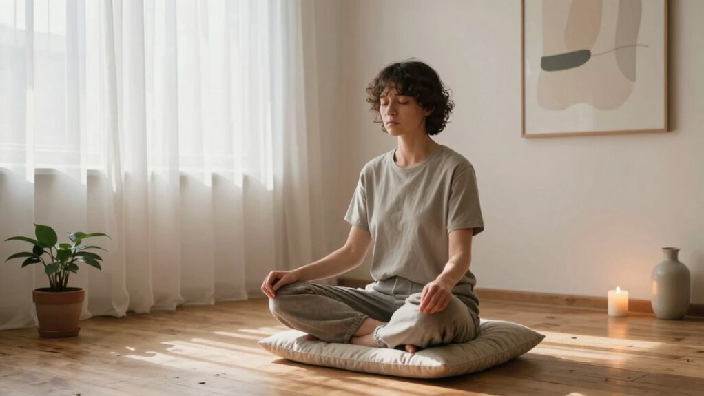 Think of your busy mind as a stormy sea—start small. Meditate for just 3 to 5 minutes, focusing on mindfulness techniques and breathing exercises. As you anchor yourself with each breath, the storm calms. Gradually extend your sessions as your mind becomes more peaceful. Remember, consistency matters more than duration—each moment of stillness builds a calmer, more centered you.